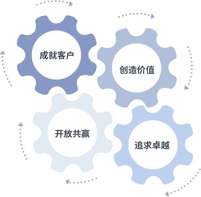 成就客户是一切决策的出发点,创造价值是衡量所有工作的标准,追求卓越是44118太阳成城集团做事做人的态度,开放共赢是44118太阳成城集团的格局也是最终的结果。价值观的齿轮环环相扣,推动着组织里的每个人不断向前。